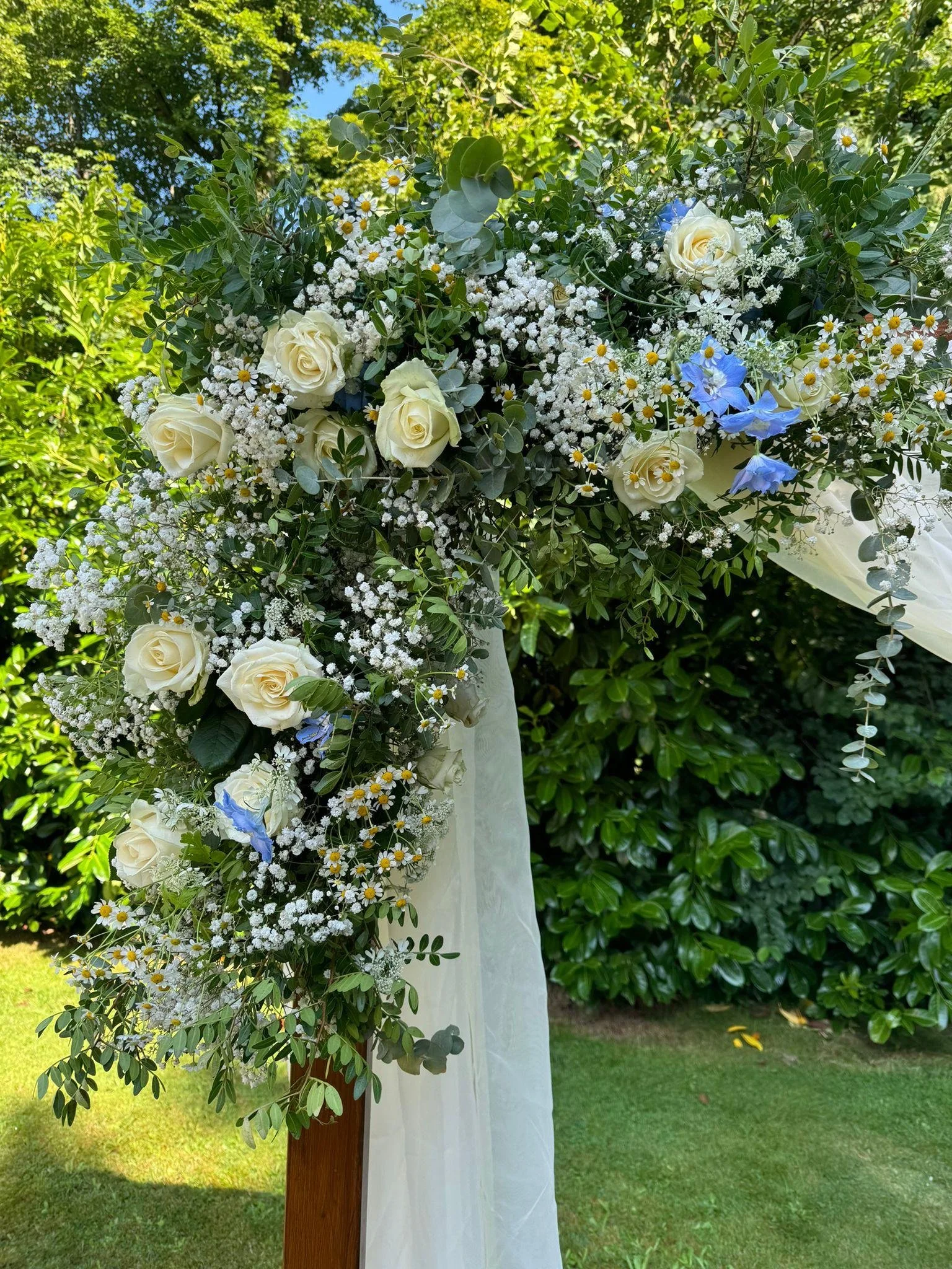 An hour later, as guests began arriving, a woman with a pram approached us looking concerned. She’d stayed the night before. “One of your flower foams has fallen off the arch,” she said.